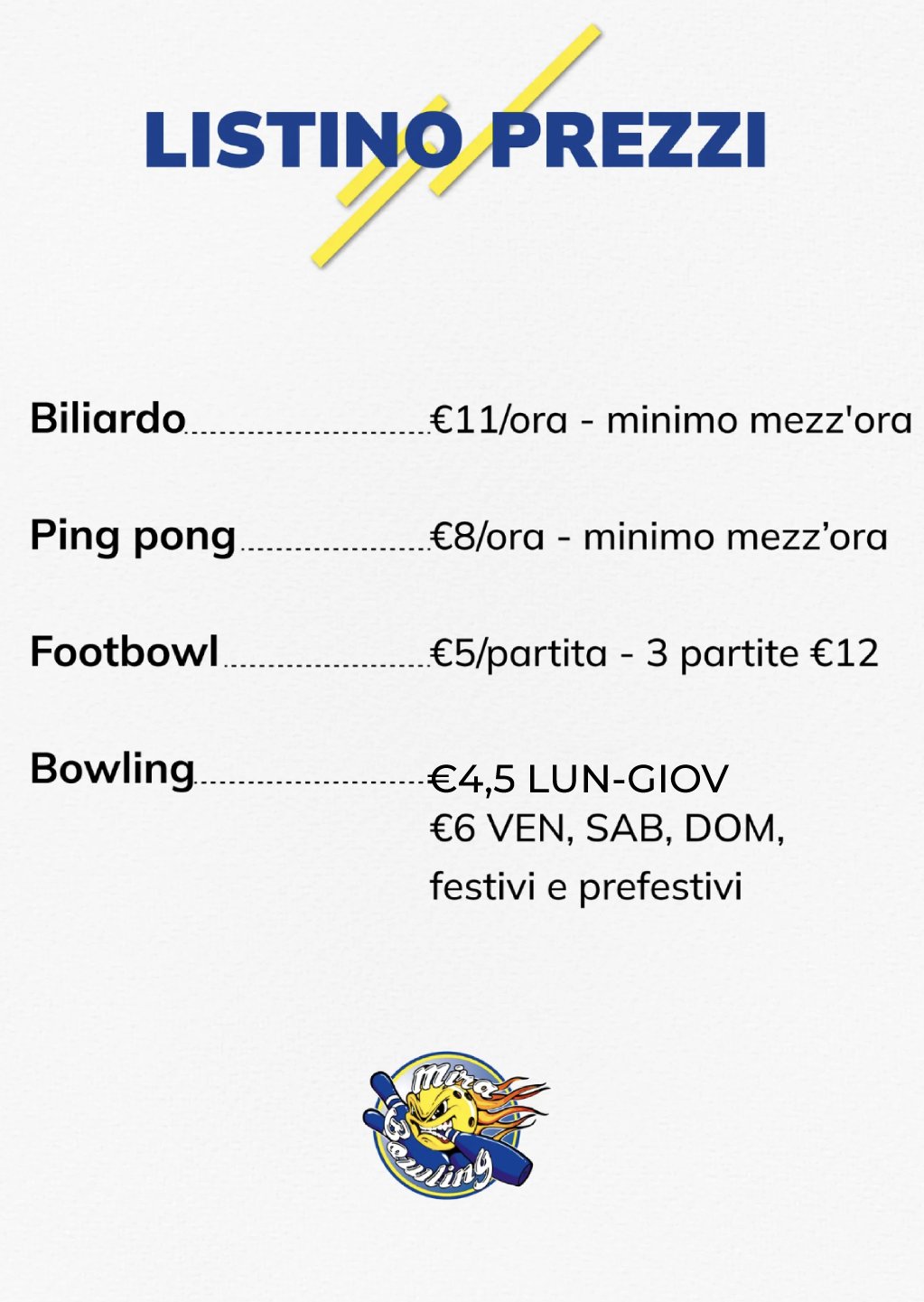 Mirabowling offre una vasta gamma di attrazioni, dalla sala giochi con giochi arcade, flipper e air hockey, alle tavole da gioco di alta qualità per gli appassionati di biliardo. È possibile organizzare feste private personalizzate e indimenticabili, mentre il nostro bowling e footbowl rappresentano l’attrazione principale del locale, con attrezzature di alta qualità e un personale cordiale ed esperto per garantire un’esperienza di gioco unica nel suo genere.